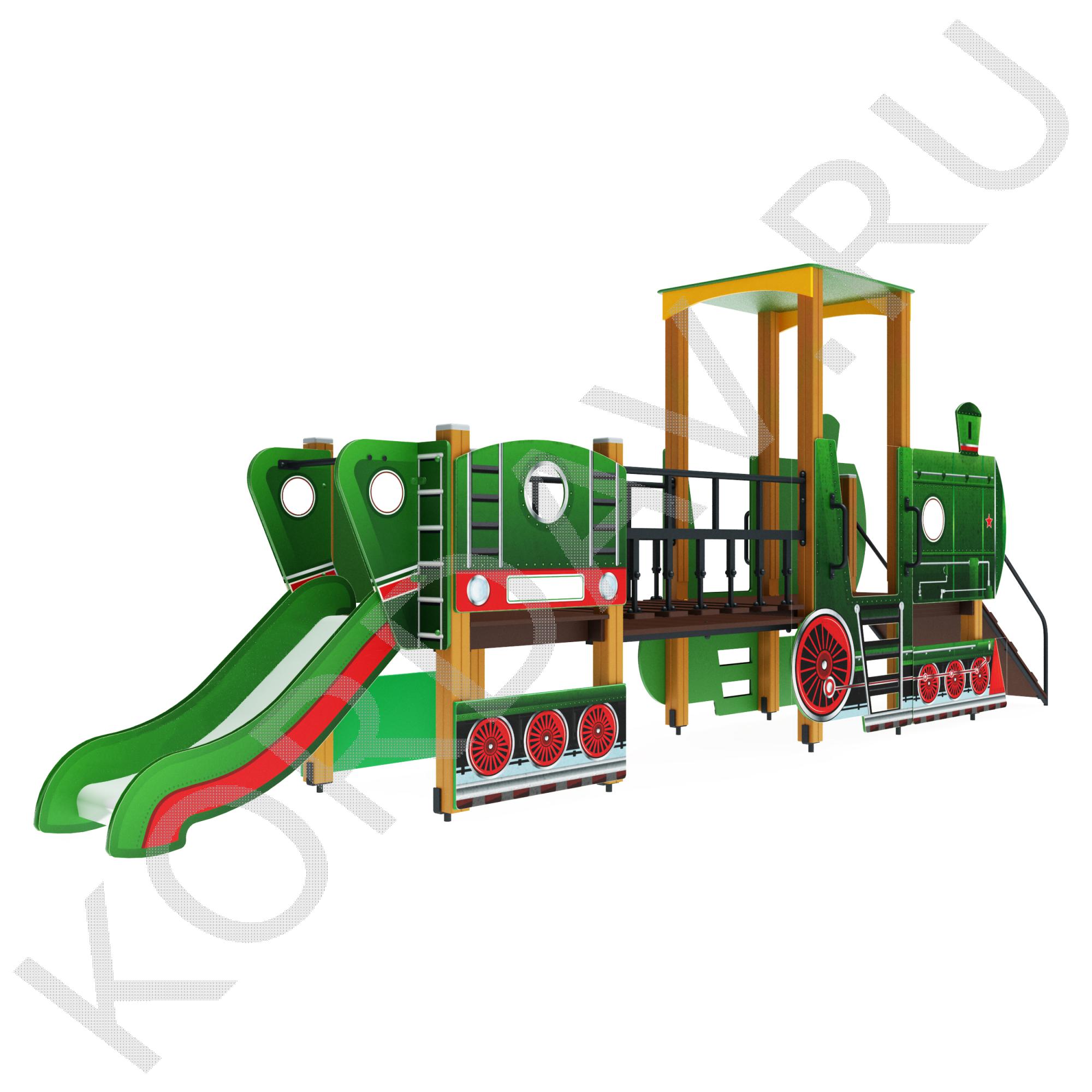 Паровозик состоит из лестницы, горкой, подвесного моста и двух башен, одна башня стилизована под паровоз, другая под вагон. Кабина имеет вход в виде лестницы с перилами. Также в кабине паровоза расположены два фанерных ограждения на металлических ножках. Вагон — закрытая площадка, имеет горку, декоративную арку и два фанерных ограждения с рисунком. Снизу по бокам расположены декоративные колеса. Вагон соединён с локомотивом мостиком с фанерным ограждением. Вся конструкция крепится на деревянных столбах. Закрытые вагоны удобны для перевозки людей или мелких грузов. Данный комплекс предназначен для детей от 2-х до 3-х лет.